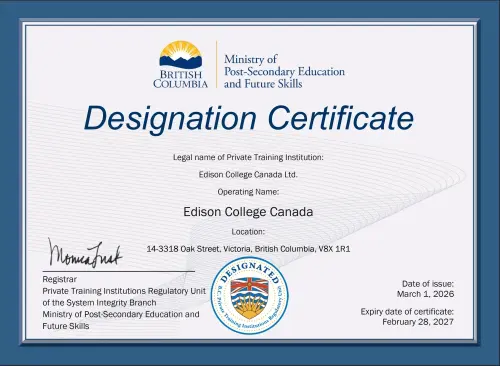 Founded in 1973, Edison College Canada has a 50-year legacy of providing thousands of students a premium educational experience. Our staff are credentialed experts that bring real-world experience to give our students the edge. Our graduates also benefit from our vast network of Community partners as well as regulatory recognition – being fully accredited by the BC Government’s Ministry of Post-Secondary Education and Future Skills.